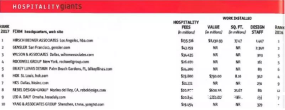 2017年 Hospitality Giants 100全球酒店设计巨头排行榜于近日发布,由美国著名室内设计杂志《Interior Design》发起,一直作为衡量全球大型酒店设计公司的榜单,再一次将HBA列为年度酒店设计排名第一的设计公司。