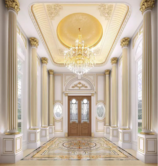 门厅处精美的地面拼花,对称的鎏金圆柱,气势非凡,像是对凡尔赛的一种敬畏,弧线形的顶面曲线增加了空间的曲线美,精美的水晶吊灯精致大气。