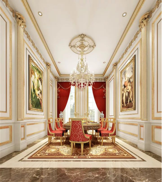 豪华的琉璃吊灯,灯光璀璨,映射奢华。两侧墙面装裱的壁画,尽显高贵的艺术气息,就像把自己置身于富丽堂皇的凡尔赛宫。以红色作为点缀,使整个餐厅色调活跃又不失主次,给人明亮开放的视觉效果。