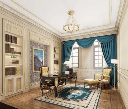 书房整体设计大气沉稳,金棕色的座椅,雕花书桌,无不增添了法式装修风格的大气。
