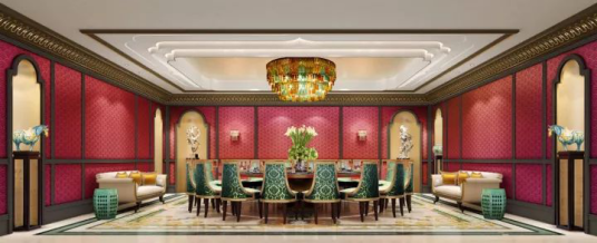 中餐厅设计上大胆采用了大面积的正红色,大胆的用绿色碰撞,增加了空间的视觉穿透力。
