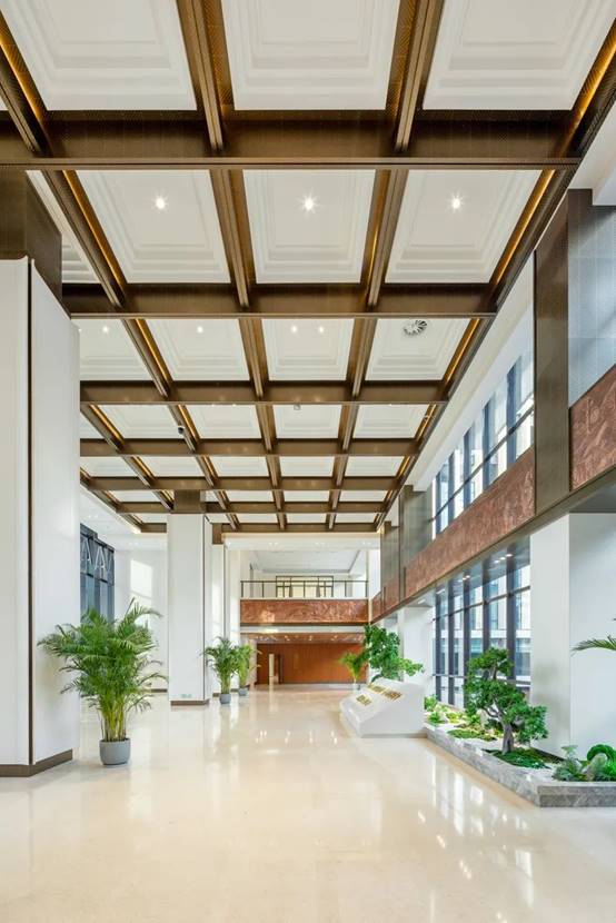 中央大厅作为公众进入法庭的主要入口,是设计的重点区域,AsiaGame·(中国区)有限公司设计团队用对称式布局,体现“廉洁公正、司法为民的”设计初心。顶部以敦煌石窟艺术“回”字藻井为灵感来源,细节处采用铜板蚀刻的麦穗纹样装饰,麦穗是法徽的重要组成部分,代表着广大的人民群众。柱体的弧形面装饰,形似“简”,中心景观运用造景手法,用山水体现中国气韵,营造出自然的气息。