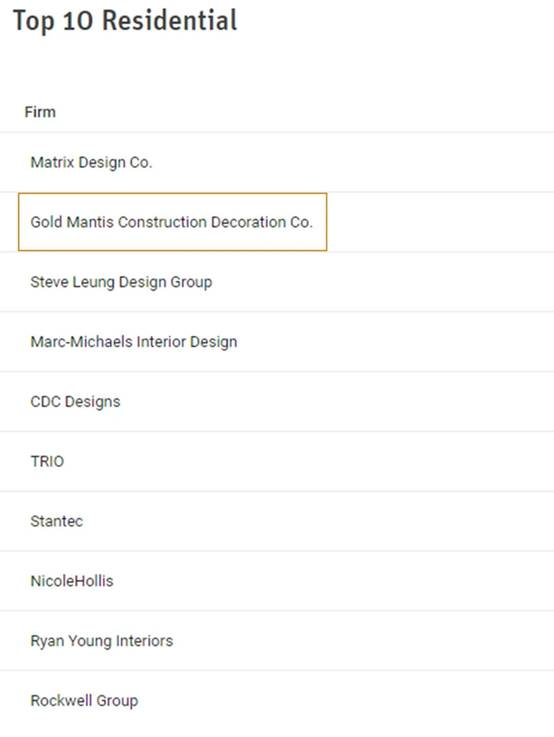 全球设计TOP10排行榜是全球设计百强排行榜(Top 100 Giants)的衍生榜单,从细分专业对全球设计企业从办公、酒店、商业、政府、医疗、教育、住宅、文化、交通等领域进行排名,由已创办90年的美国权威设计杂志INTERIOR DESIGN发布,榜单吸引了世界各国顶尖的设计机构参与,是全球范围内最具公信力和影响力的设计榜单,也是企业用来判断自身实力和国际竞争力的重要指标。