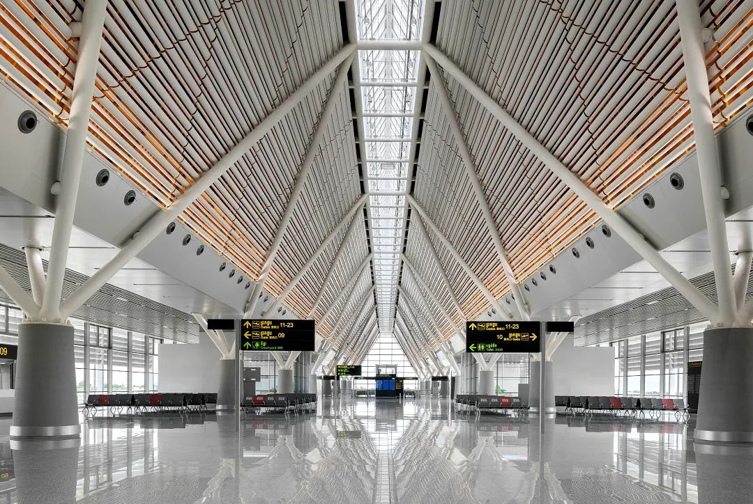 整个机场的外观宛如一座即将腾飞的飞机,面对天空展开宽阔“双翅”,随时准备与天空融为一体。