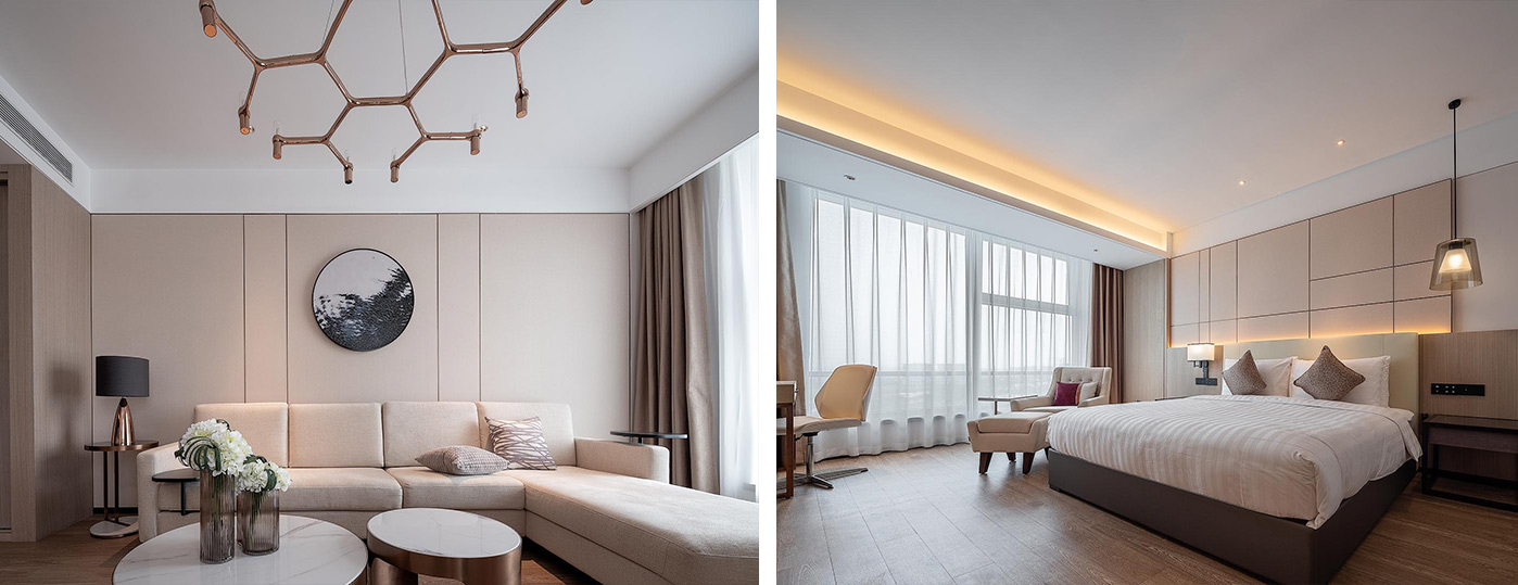 客房延续了英国特色的标志色彩,搭配简约线条家具以及经典简约的装饰,呈现出极具英式格调的优雅氛围。设计崇尚典雅、精致的生活方式,在轻松闲适中追求生活的品质。在这里,没有城市和国界,只有友好与真挚。