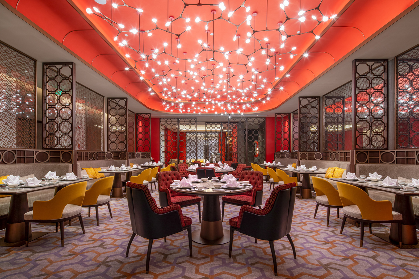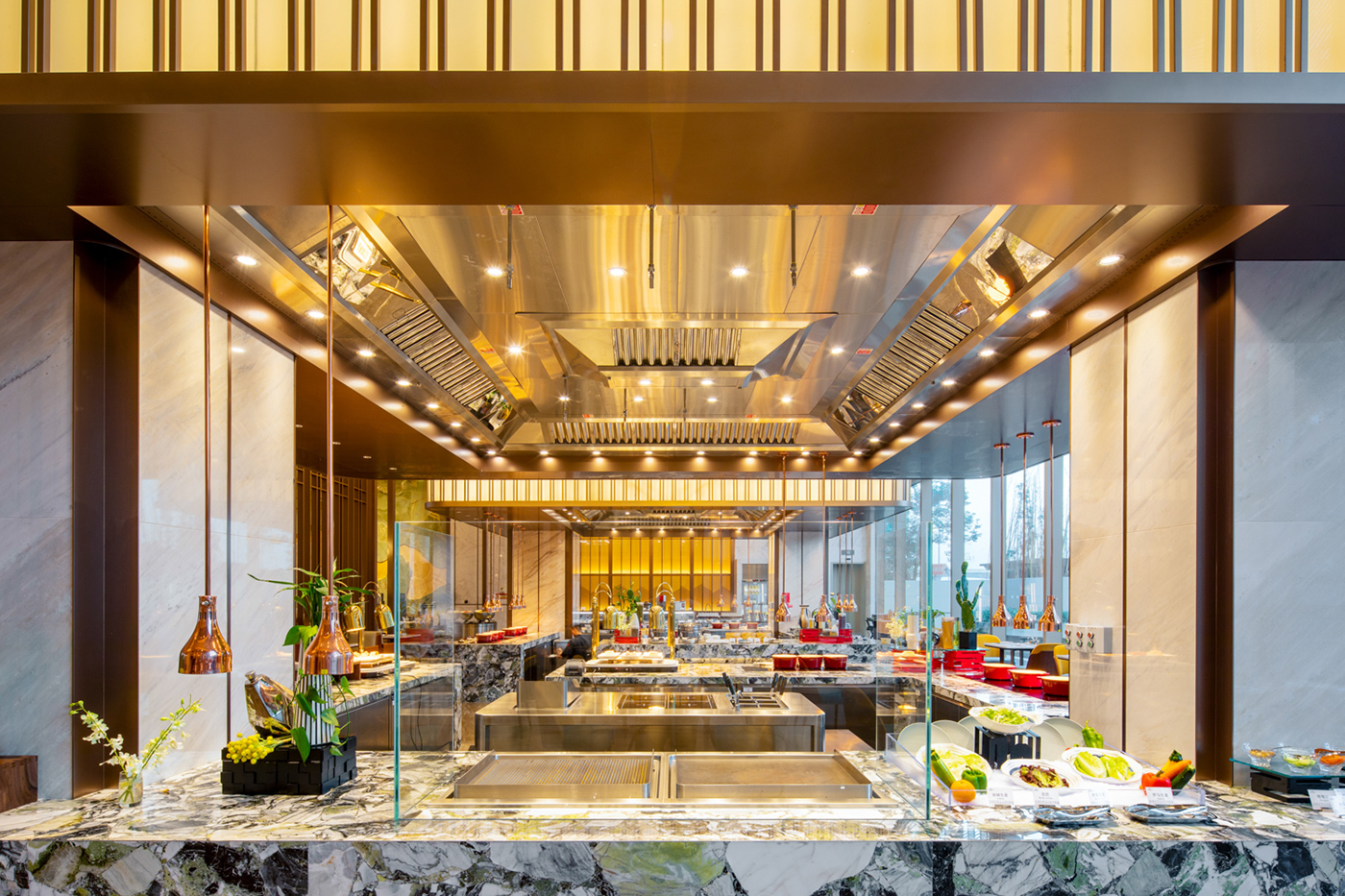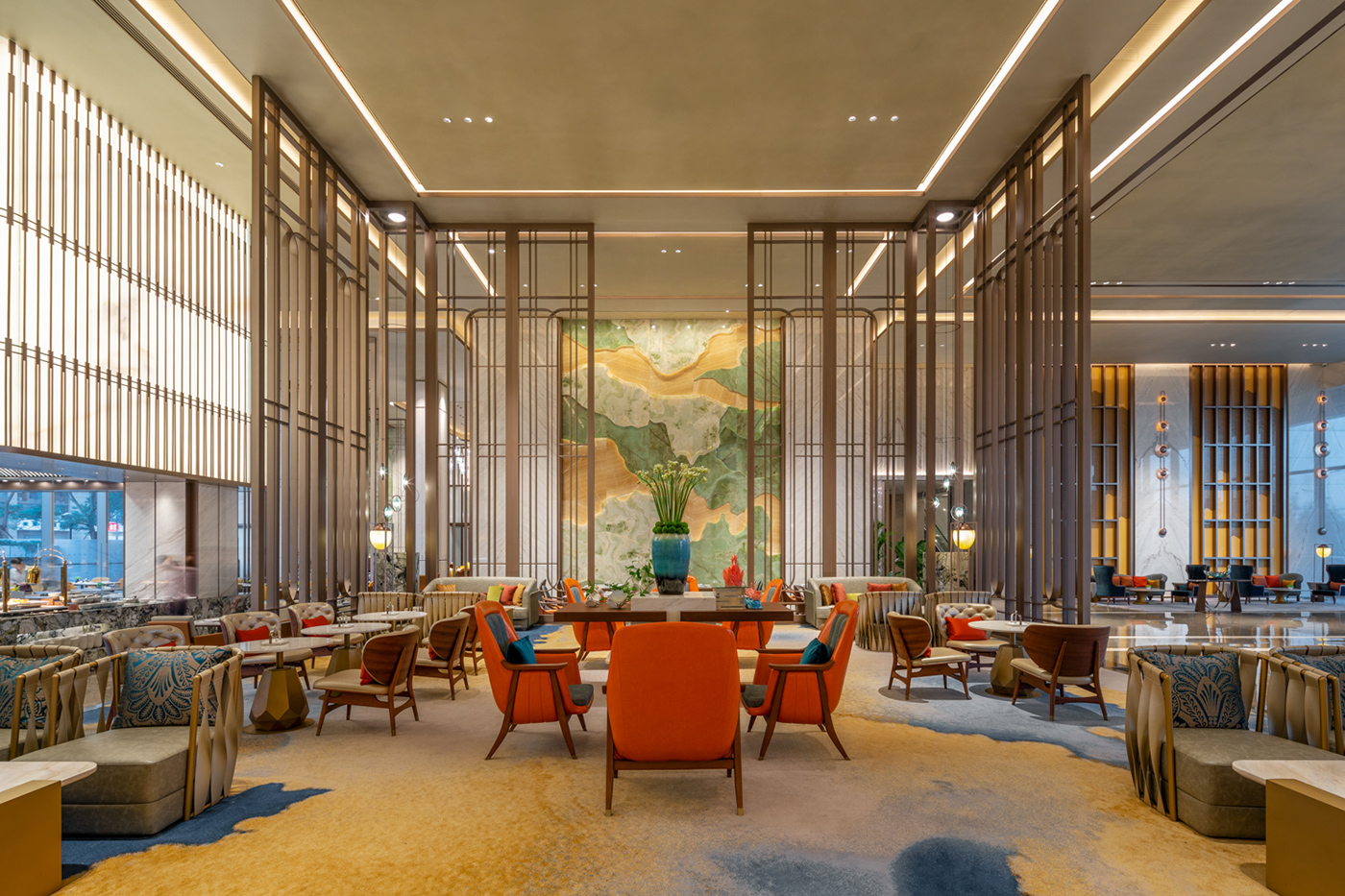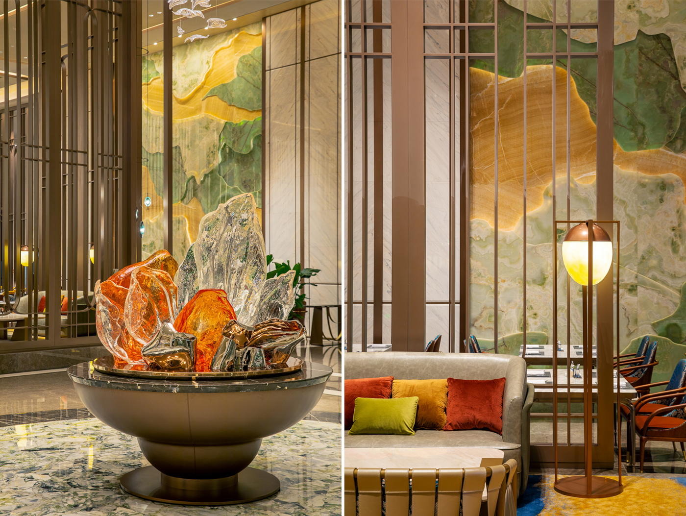 常熟日航酒店大堂整体风格融合现代中式的精粹与日式的禅意,在用材上极尽考究,地面云朵拉灰石材表面犹如星空般闪耀,与顶面的金属艺术漆相呼应;墙面的白金沙,高贵而不失肌理感;背景墙面大面积的玉石在灯光的照耀下,尽显轻奢、典雅。