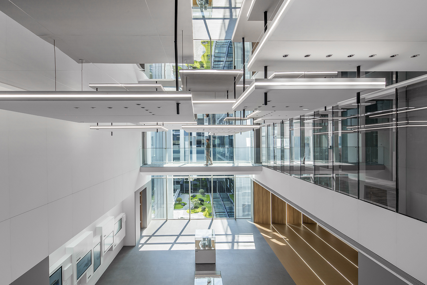 大厦不仅仅是一座办公楼,更是一座承载着历史与文化的艺术殿堂。每一个幕墙板块都像一件艺术品,流畅的线条、斑斓的色彩,犹如水墨画中的笔触,为这座建筑赋予了典雅而高贵的灵魂。大厦塔楼每四层创造一个垂直院落,仿佛是苏州民居中一进进的院落在垂直方向上的现代演绎;每四层一圈外廊形成空中环廊,宛如苏州园林中的“廊”,将人与自然完美融合。垂直院落与空中环廊共同构成观景最美中轴线,让人在城市的繁华中领略到苏州园林的绝佳视角。下沉庭院及光导管的空间布局,使得办公区域采光系数得到提升,有效改善了室内自然采光条件。南北双庭院和裙房屋面光导管及天窗的构思,更是在满足功能需求的同时,将苏州传统园林的美学发挥得淋漓尽致。