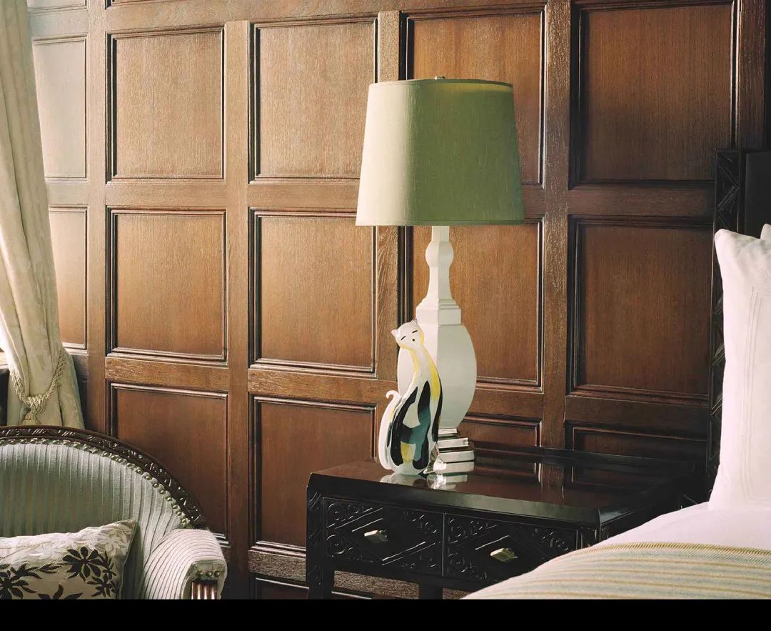 wooden wall panels and columns, and old-fashioned table lamps give an elegant, Shanghai-style vibe.