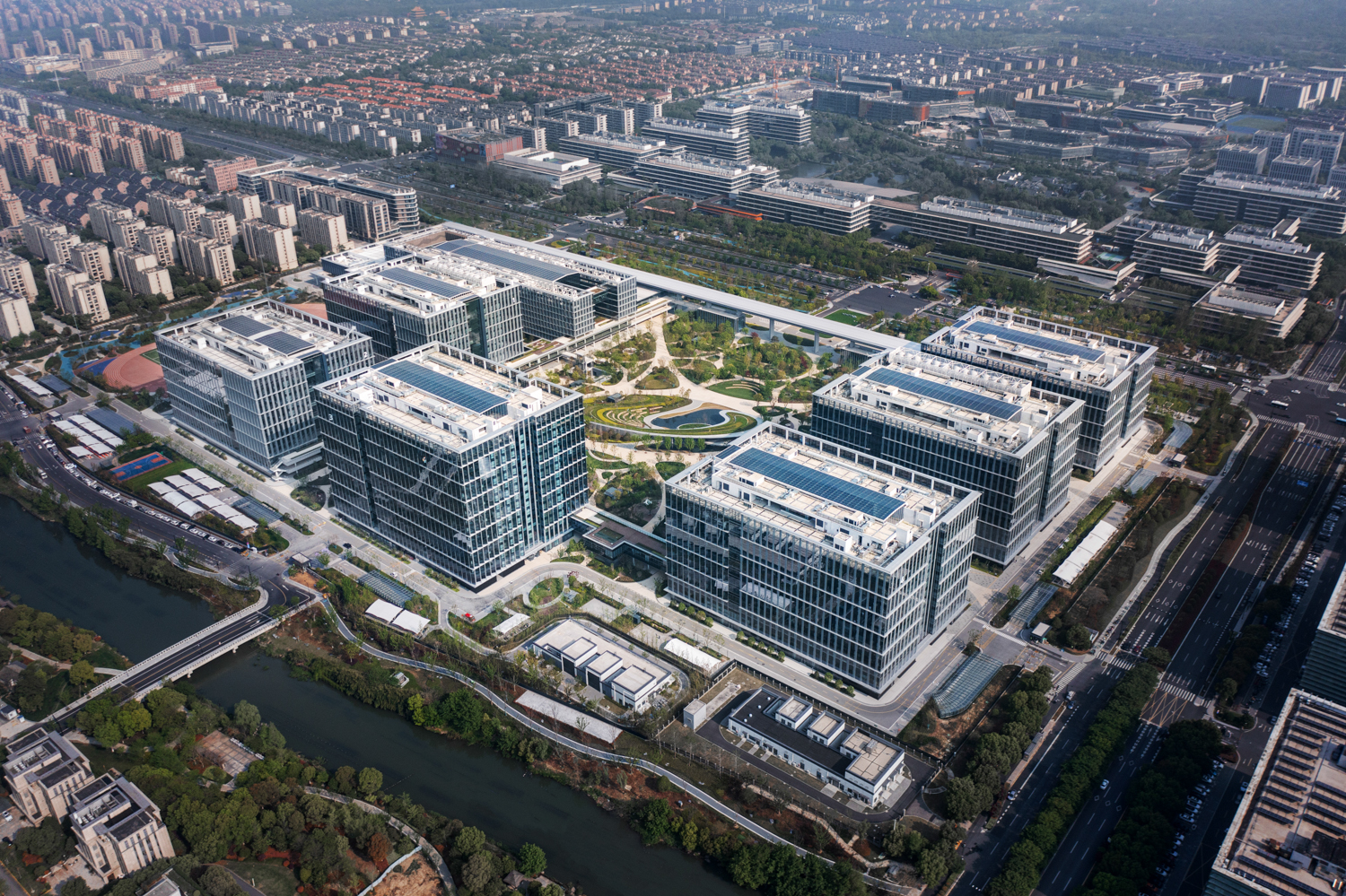 以“ESG、科技、人本”为核心理念,园区融合了海绵城市、雨水回收、碳中和、机器人与无人车应用、生物多样性养护等环保生态措施,致力于构建一个绿色科技、智慧健康、洁净的园区。