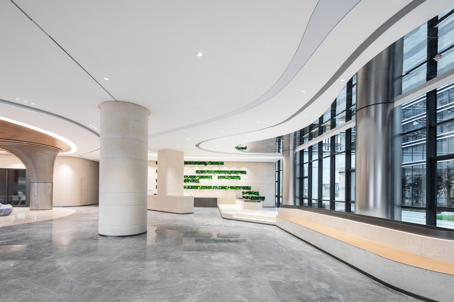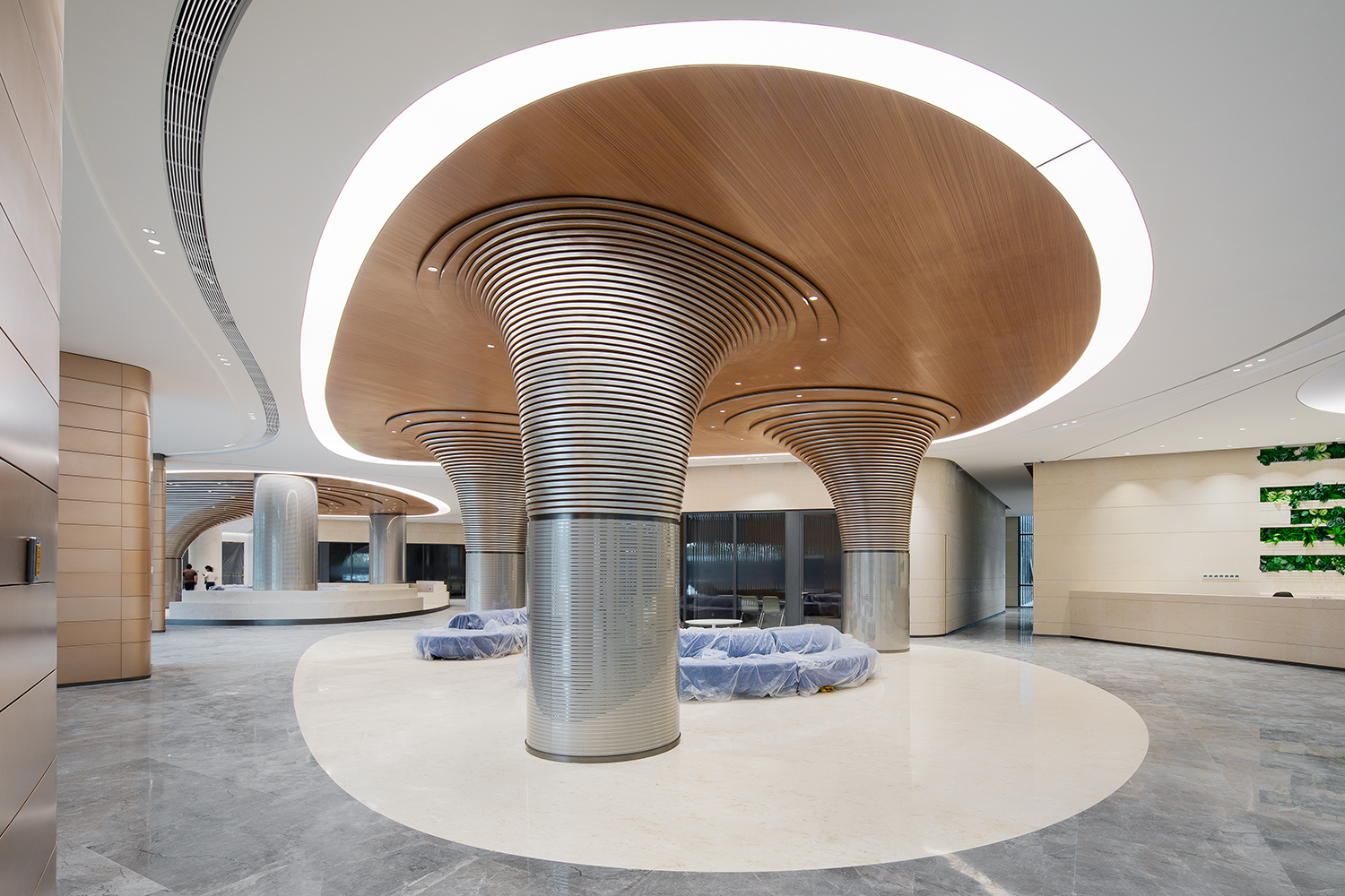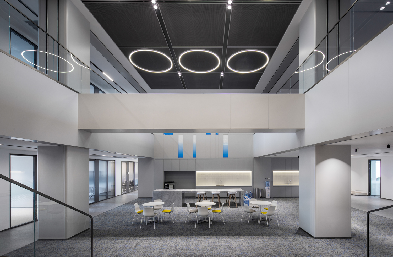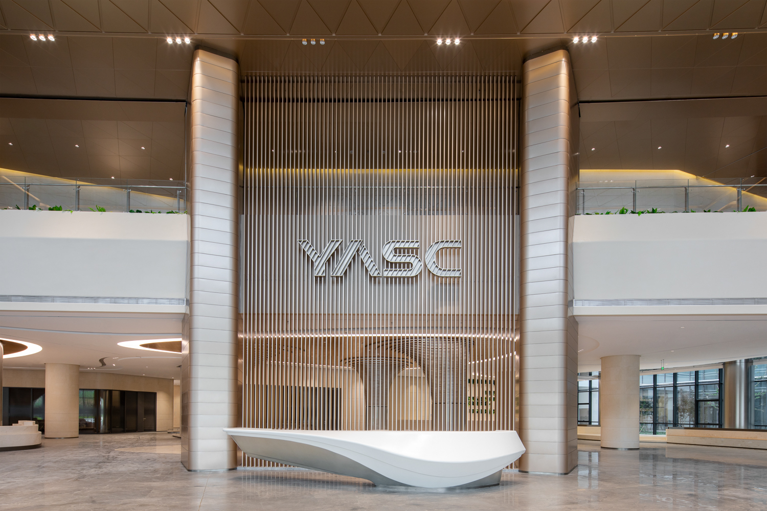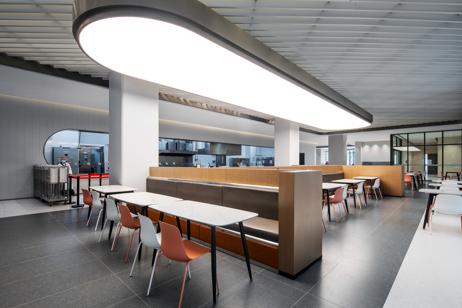 AsiaGame·(中国区)有限公司承接了长飞先进武汉基地地下两层与地上七层的室内精装修工程,总施工面积达30000m²,涵盖共享办公区、访客大厅、会议空间、餐厅及公共区域等。在这里,设计美学与文化内涵深度融合,成为了科技与人文交织的创新典范。