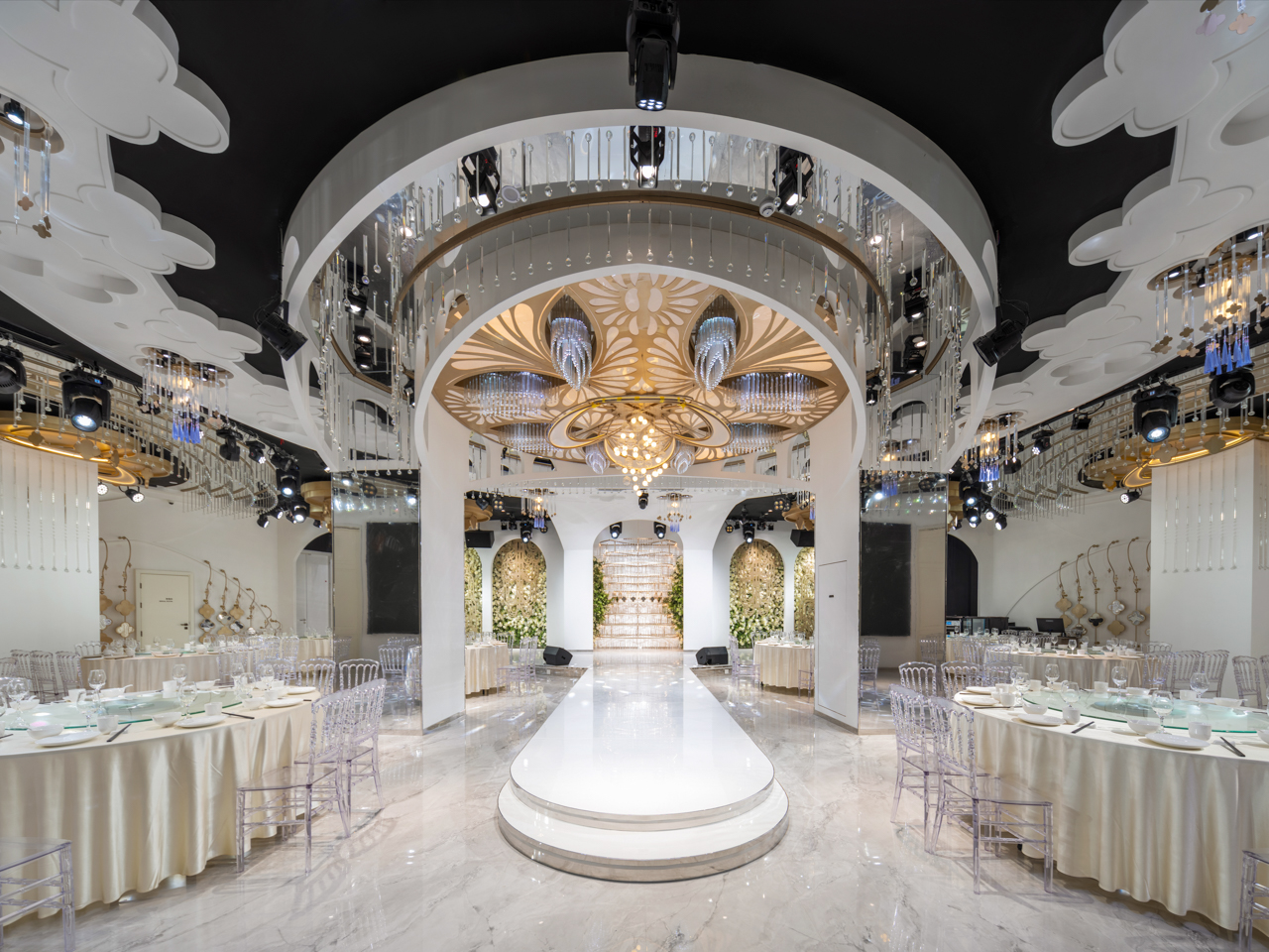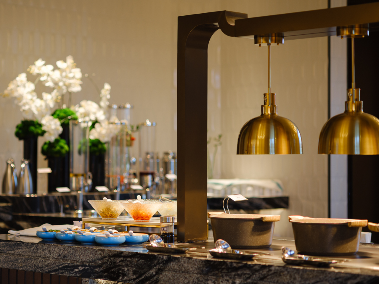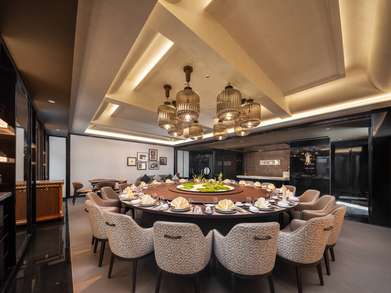 从酒店大堂到餐厅布局再到客房内饰,都可见“对称之美”:大堂立柱及灯饰,前厅中央的插花,两端相对位置摆大小款式完全相同的烛台等,不仅是在视觉上极其工整的审美表达,同时在气韵上也无不彰显和谐大气之美。