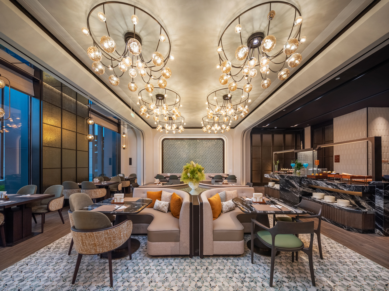 酒店以盛唐风华和诗礼东方的待客之道为灵感,营造庄重典雅的空间;诗礼东方,这四个字如同一扇穿越时光的门,敞开着远古东方文明的绚丽画卷