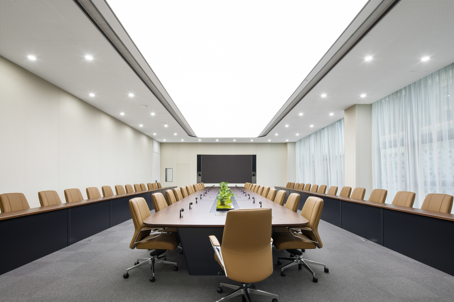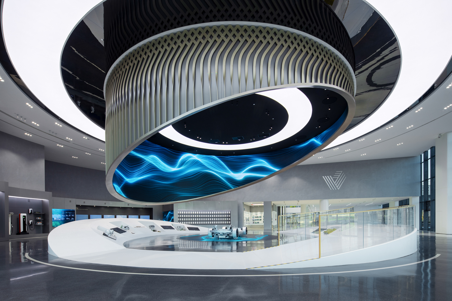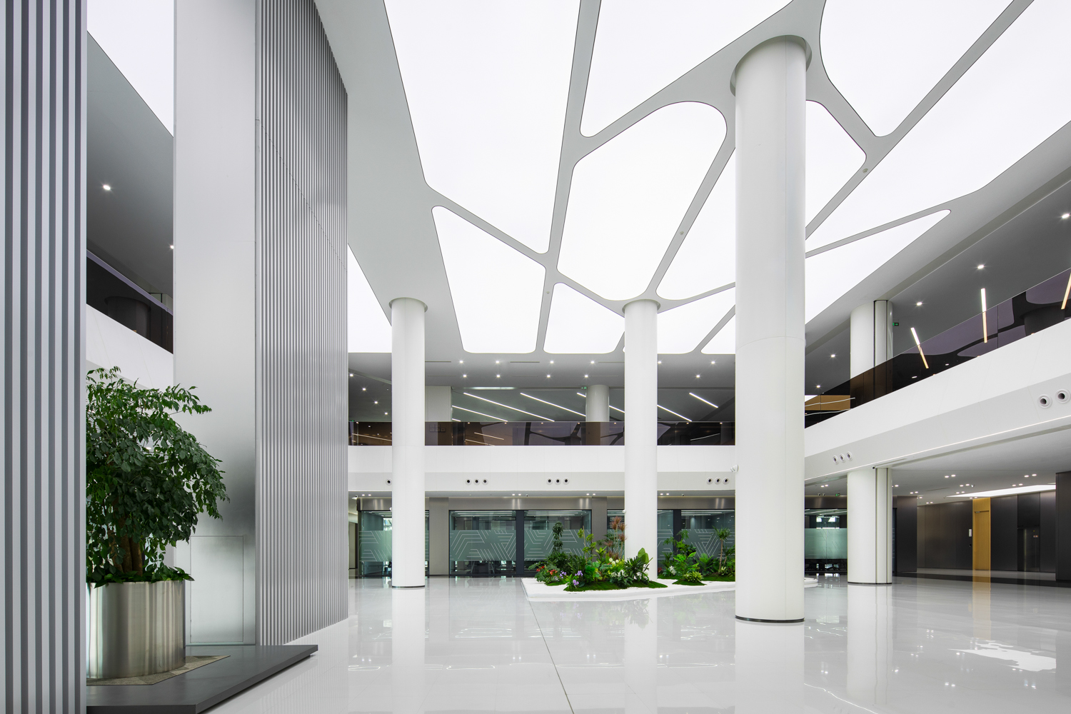 科技感的设计风格延续至室内,“科技静谧,人文温暖”为基调,形成东方智慧、水绿交融的生态理念,保留了作为科技工厂的先锋设计风格,“四水归堂”的中庭概念进一步延伸,形成视觉通廊。