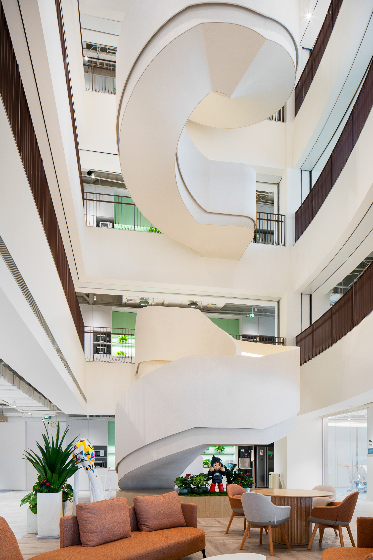 一座造型别具一格的建筑正拔地而起, 仿佛一座绿意葱茏的梦幻“空中花园”
