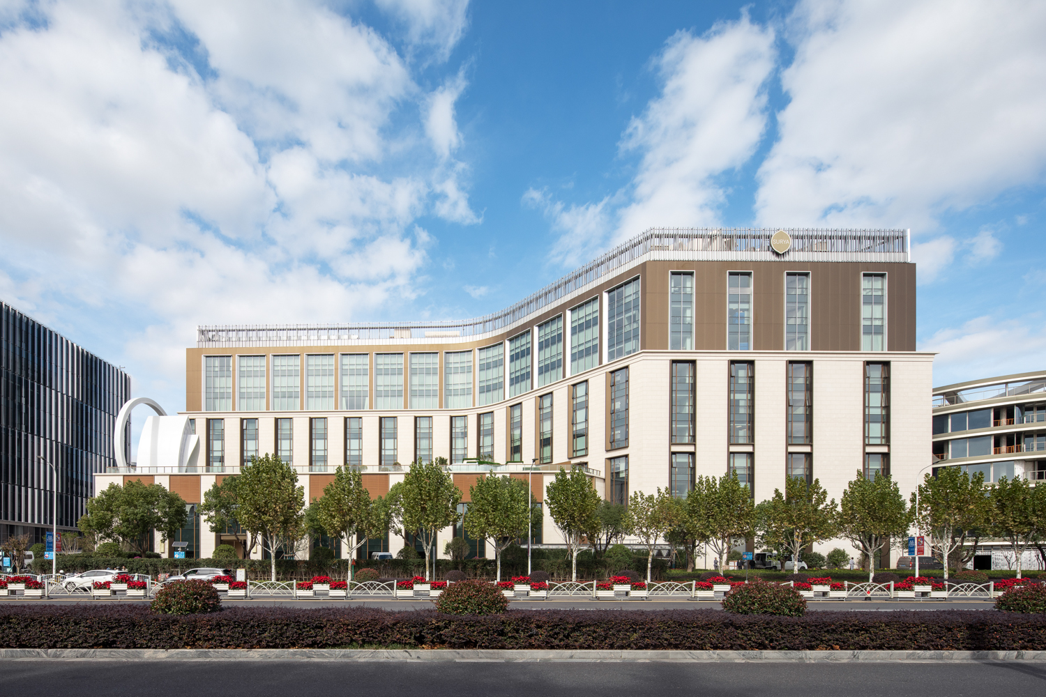 酒店建筑形态柔和、线条流畅,以“流动的江南”为设计诗学,将传统屋檐、廊道、水景与现代玻璃、金属材质交融。立面如行书般流畅,空间如画卷般展开,鳞次栉比形成富有节奏感的体量关系,质感“微光一过,粼粼皱碧”。